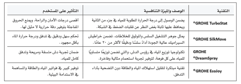• المنتجات الفاخرة (GROHE SPA): علامة فرعية متميزة تركز على التصميم الحصري، والمواد الفاخرة، وحلول الاستحمام المخصصة لإنشاء تجربة سبا منزلية فائقة، مما يستهدف قطاع الفنادق الفخمة والمساكن الراقية.